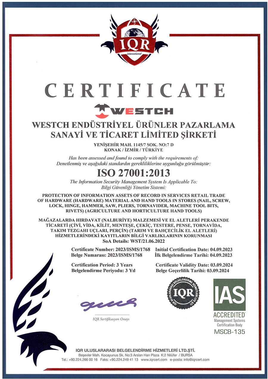 Westch kalite yönetim sistemi, ISO 9001 ve ISO 27001 kalite belgeleri ile sertifikalandırılmıştır.